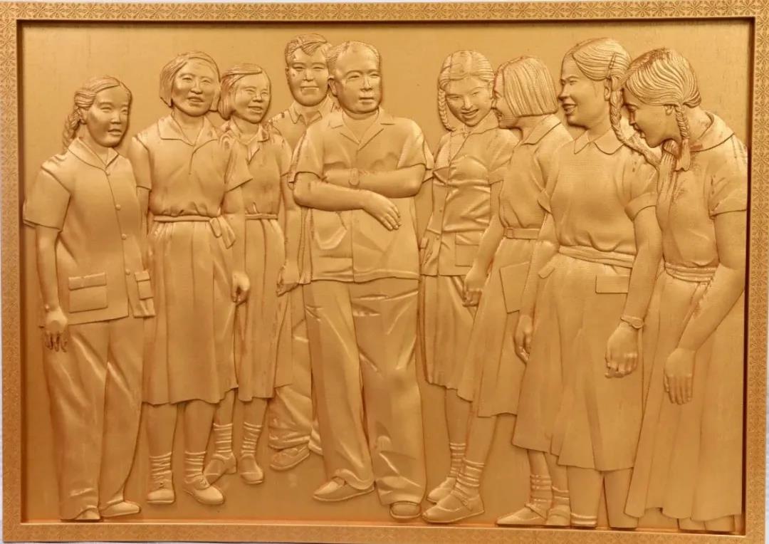 尺寸為1040mm×740mm,完工重量2kg。工模具廠選用40mm木料板材,經過圖片轉換、編制程序、雕刻加工、表面處理、手工上色五個階段、15道工藝制作完成。該作品生動展示了1959年5月31日國務院副總理陳毅來經緯視察的場景,揭開了經緯發展新的一頁。